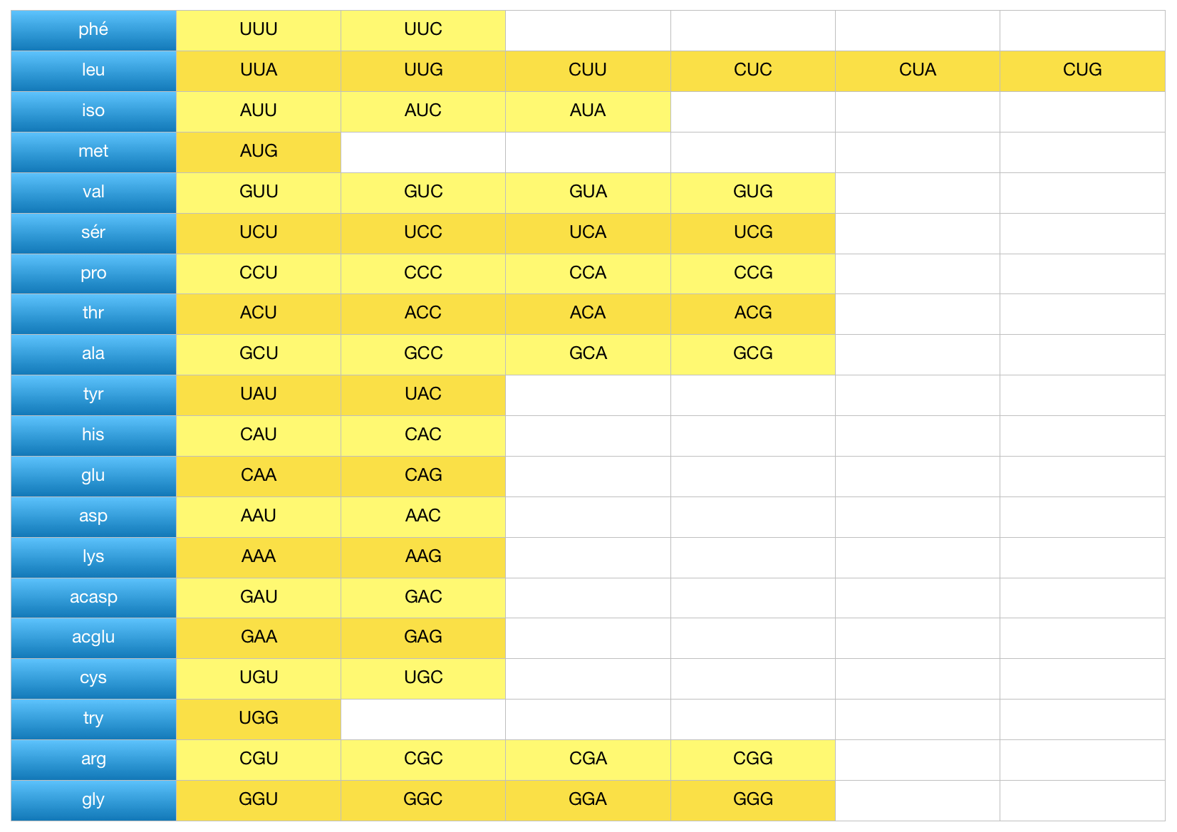 Comme nous avons 4 lettres et que le code requiert des séries de 3 lettres, il est possible de former 64 différentes séries de trois lettres. Ces groupes sont appelés CODONS. Nous avons 64 codons pour coder 20 acides aminés. Il y a un surplus, et c’est là le secret de la réponse à notre question initiale: le même acide aminé peut être codé par plusieurs (1 à 6) différents codons. Voir le tableau suivant, où les 20 acides aminés apparaissent dans la première colonne, et les codons correspondants dans les rangées adjacentes.