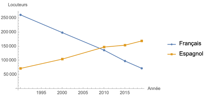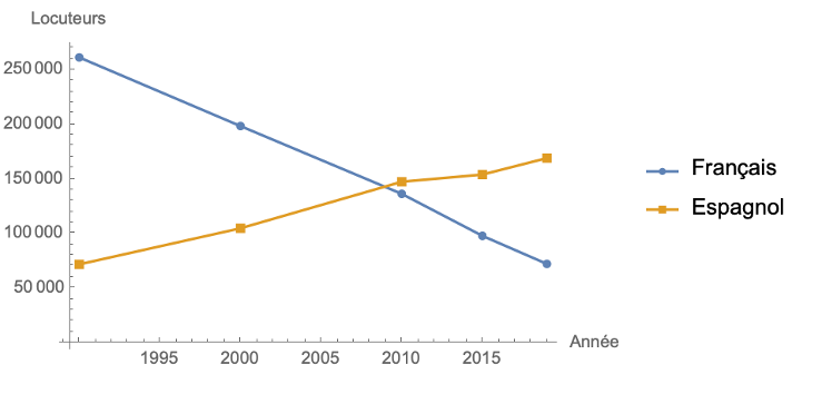 Les données du recensement[xxiv] nous informent à propos du nombre de locuteurs âgés de 5 ans et plus parlant le français à la maison dans l’état de la Louisiane. L’espagnol est inclus pour fin de comparaison.