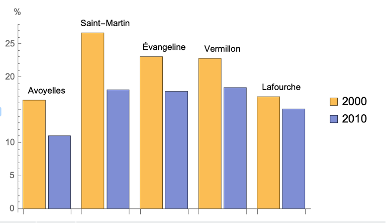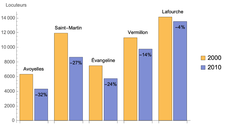 On constate une baisse importante du poids du français entre 2000 et 2010. Aucune paroisse ne dépasse maintenant les 20 % de francophones. De gauche à droite, les paroisses sont représentées du nord au sud : Avoyelles, au sommet du triangle d’Acadiana ; Vermillon/Lafourche adjacentes au golfe du Mexique. On note que le nombre de locuteurs accuse une baisse de plus de 30 % au nord, mais que cette baisse diminue fortement lorsqu’on se dirige vers le sud.