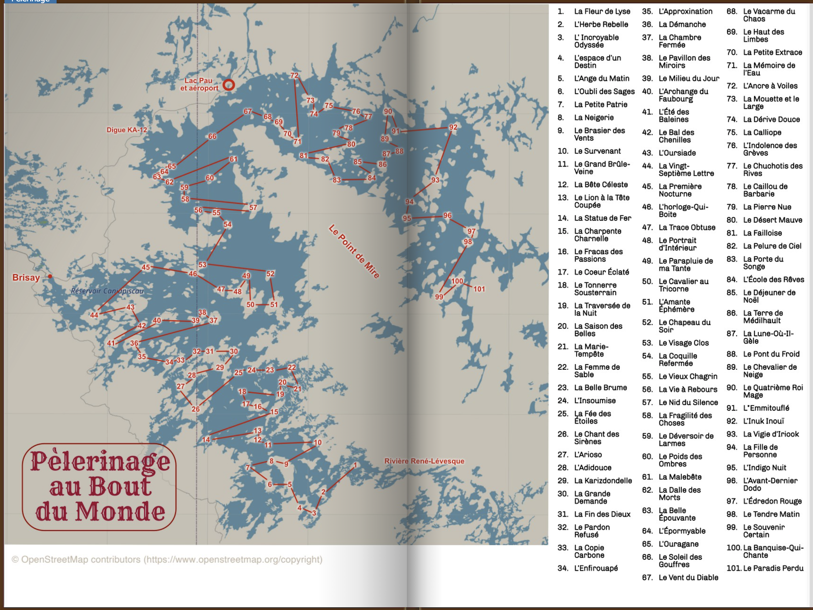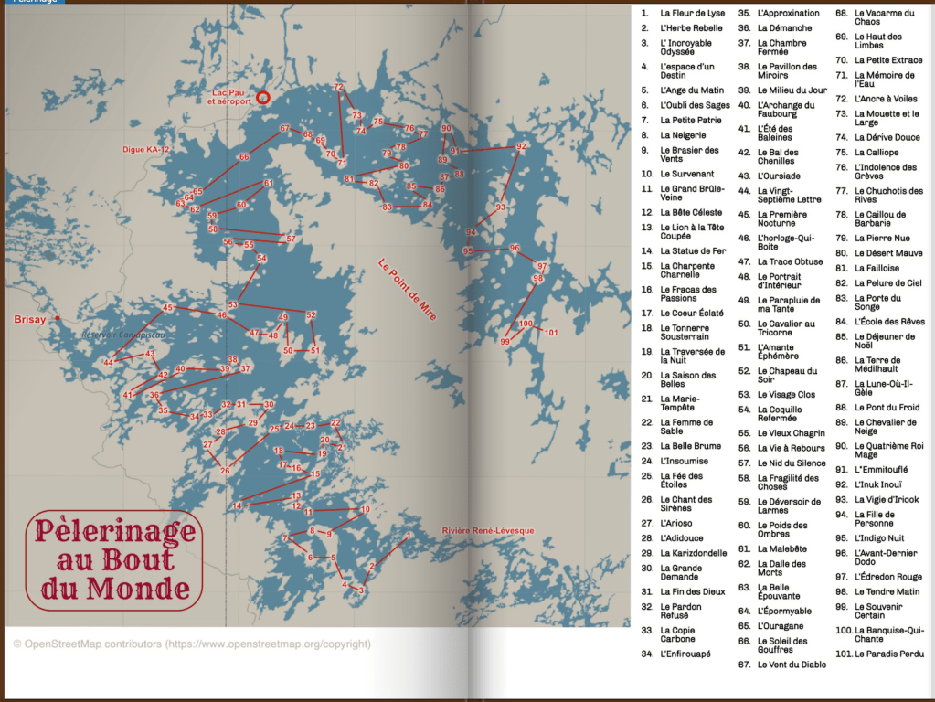 Philomène Barbeau, détective à la SQ qui s’est rarement éloignée de Montréal, devra composer avec la vie en région éloignée lorsqu’elle est chargée d’enquêter sur un meurtre qui a eu lieu sur une ile du Réservoir de Caniapiscau. La victime, un dirigeant d’Hydro, participait à un étrange pèlerinage entre les iles du réservoir, iles nommées en 1997 en l’honneur de textes d’auteurs québécois pour commémorer la loi 101.
