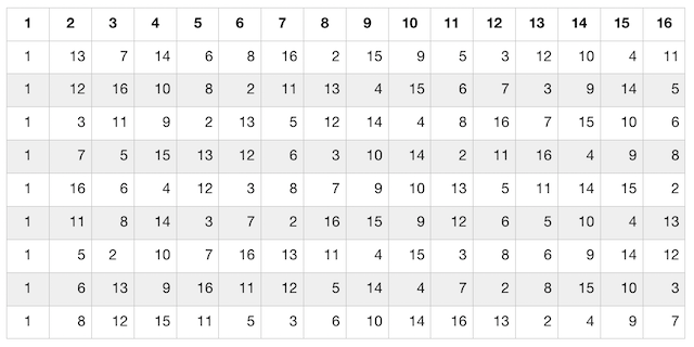 - The ten columns 2-3-5-6-7-8-11-12-13-16 go through these same 10 numbers