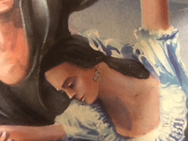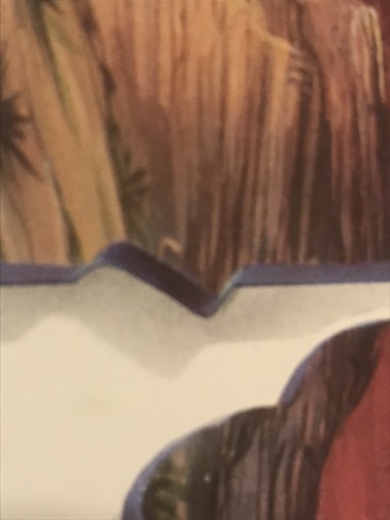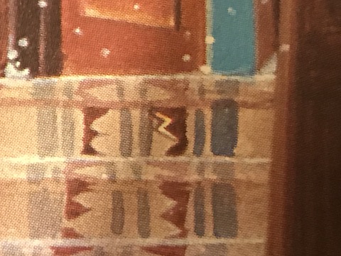 There are six diamonds. We are therefore looking for six letters. It turns out that we only have to find a single: Z. It is found in the design of the carpet on page 53. It is then interpreted as meaning IZZARD, another name for the letter Z. This is not an easy one to find, but it occurs in LODGE, next to the open door showing a BLIZZARD outside. Perhaps a clue.