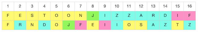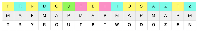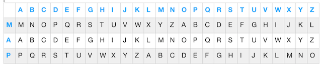 The second line above does not make any sense. The solution is to pass this line (viewed as cipher text) through a Vigenere matrix, using MAP as the key. This key indicates which alphabet is used to decrypt each of the letter. Depending on the letter, one of three alphabets will be used: M, A, P. These are the relevant alphabets.