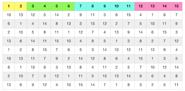 - The ten columns 3-4-5-7-8-9-11-12-14-15 go through these same 10 numbers.