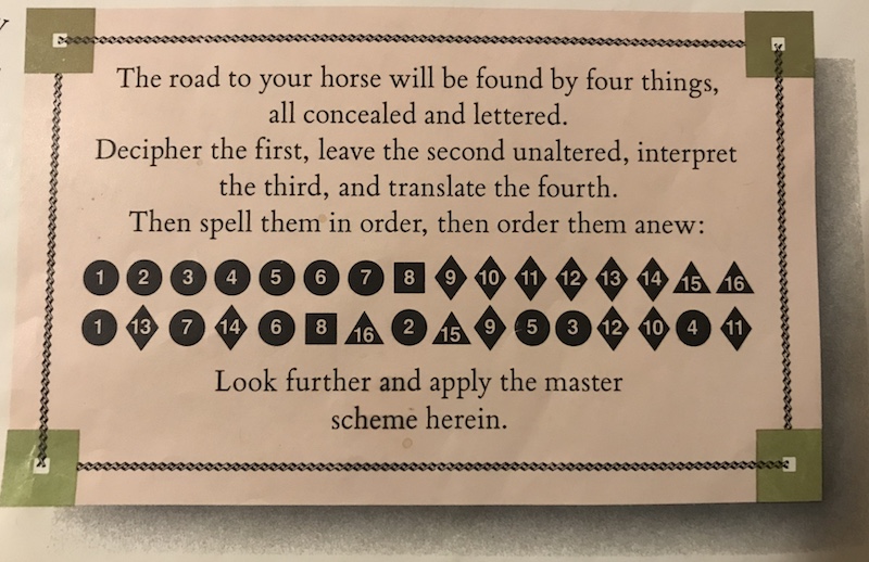 This card is most unusual in the sense that it seems to be directed at us and clearly refers to some kind of puzzle, whereas most of the book is seemingly concerned with storytelling. Unsurprisingly, this card attracted a lot of attention from treasure hunters.