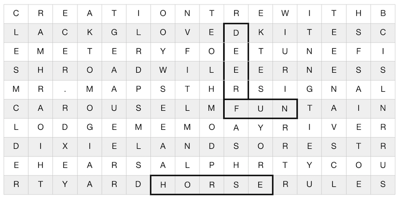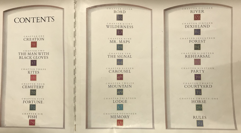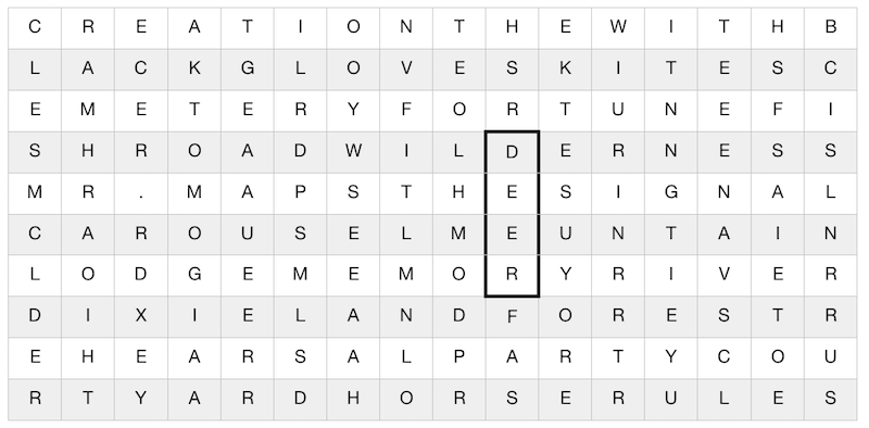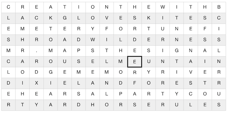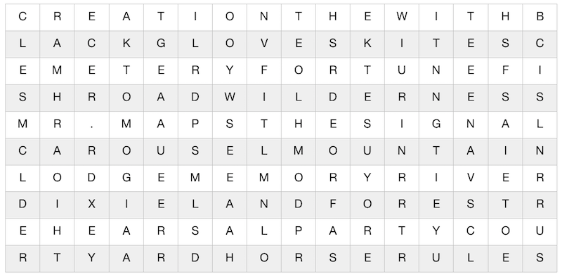The colored squares spell STIGNORESTATESHAPEATA. The ESTATE is where she lived with her father. It covers chapters 7-12. And indeed, we find an unhealed wound in the mountain in Chapter 7 (ROAD)! And the wound has the shape of a state: IDAHO.