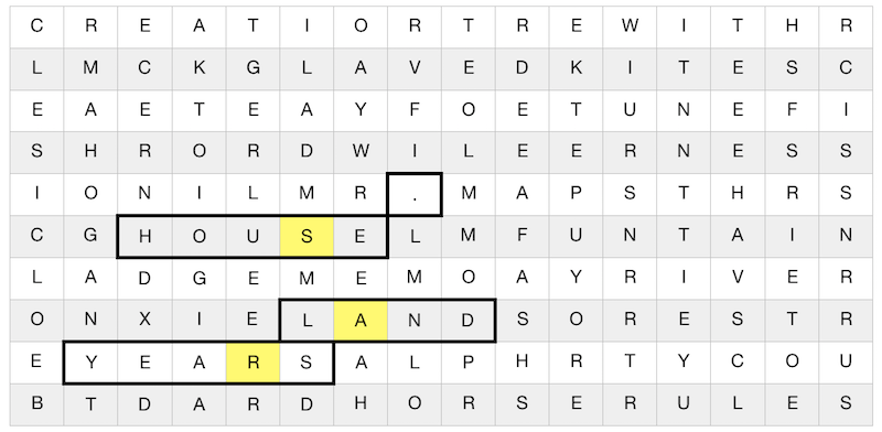 Note: one avenue that was not pursued for this clue involves moving the five diagonals going through HORSE in the last row of the grid, until HORSE is at the HOUSE position. This would have made what follows impossible.