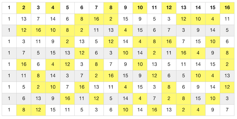 If we then apply the transformation to form a 16 x 10 table, we get the following (color is used to represent the value 1; the rest is 0):