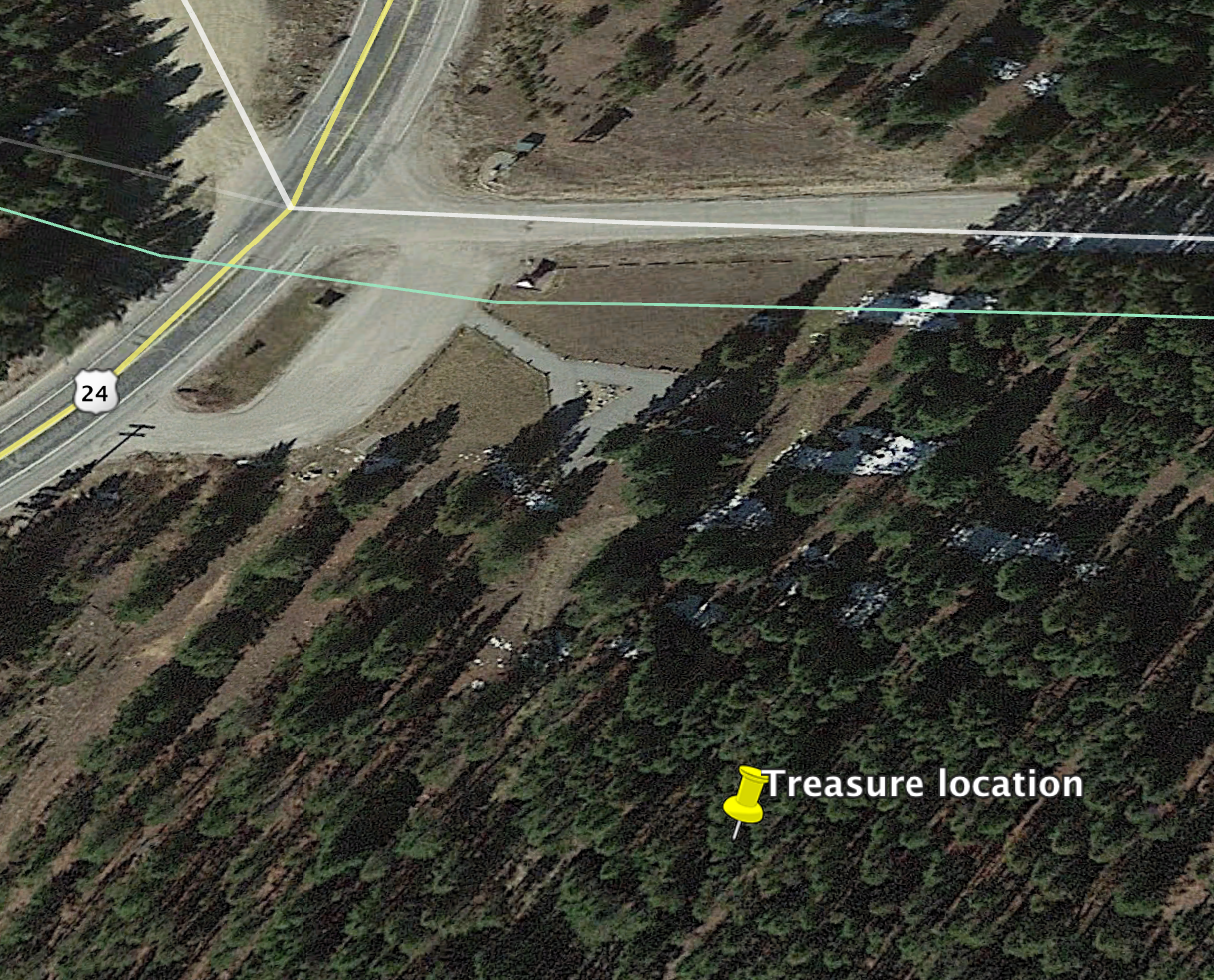 The position of the pin marking the Treasure location was calculated based on reports that it was located 238.5 feet from the small monument, at an angle of 150 degrees.